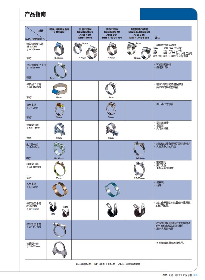 具有光滑坚固的箍带内壁及向外翻卷带边的卡箍才能减少对软管的损伤,从而减少泄漏的危险。选择卡箍就是要选择能紧紧夹住软管的卡箍。但橡胶长时间磨损会使卡箍慢慢松脱。 象这样既能夹紧又不损伤软管的卡箍您有很多选择吗?确定无疑的是您应该选择 ABA 传统型卡箍。