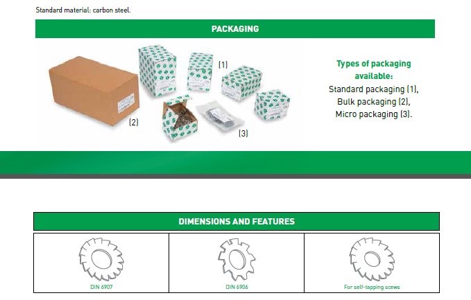 Screw size | Internal diameter min.-max. | External diameter min.-max. | Thickness min.-max. | Number of teeth | Kg/1000 pieces * | N° pieces standard packaging | N° pieces bulk packaging | N° pieces micro packaging |