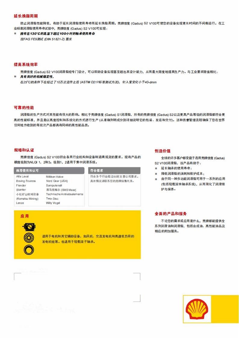 壳牌佳度(Gadus)S2 V100润滑脂经专门设计。可以帮助设备实现甚至超出其设计能力。从而提高生产力。与工业要求限值相比;
