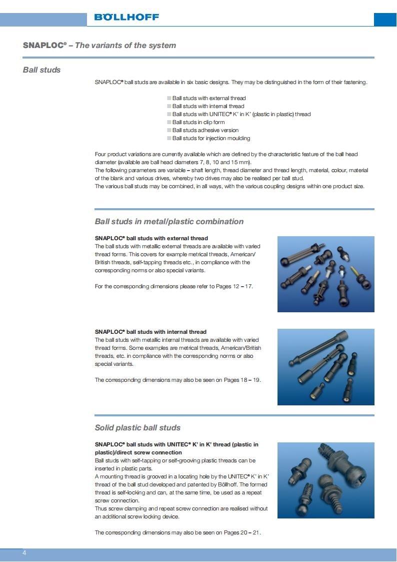SNAPLOC® ball studs are available in six basic designs. They may be distinguished in the form of their fastening.